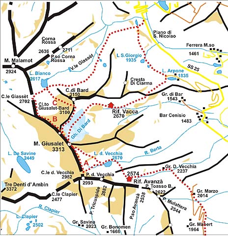 Rifugio Avanzà Si trova a 2574 m., su una spalla della cresta fra le Valli Clarea e Cenischia ad occidente del Passo Avanzà, nel comune di Venaus. Di proprietà della Pro Loco di Venaus, moderno ed accogliente aperto nella stagione estiva. Da Susa con la SS. 25 del Moncenisio fino al Paese di Giaglione, proseguire ancora lungo la statale, fino al bivio a sinistra per la Val Clarea, qualche chilometro più a monte, svoltare e salire per una ottima strada asfaltata alla fraz. Di Santa Chiara 1495, ove è preferibile lasciare l 'auto. Da qui una sterrata sale fino al bacino di carico dell' impianto idroelettrico, 2000 m. circa poi a destra ancora su sterrata, ora pianeggiante fino ai ruderi delle Grange Marzo 2014 m., presso le quali si incontra la mulattiera che sale da Bar Cenisio. Proseguire per il sentiero ben tracciato ai ruderi delle Grange della Vecchia, ed al Rifugio. ( 2.30 h ) Rifugio Piero Vacca Sorge su di un pendio di detriti a 2670 m. nel largo anfiteatro del versante est del Monte Giusalet, a sud della cresta est della Cima di Bard. Di proprietà della sez. del CAI di Susa. Costruito nel 1982 e dedicato al volontario del Soccorso Alpino di Piero Vacca caduto alla Rocca Sbarua. Da Susa con la SS. 25 del Moncenisio fino alla frazione di Bar Cenisio, subito oltre l' abitato, diparte a sinistra una carrareccia sterrata, aperta nella stagione estiva che conduce al Lago del Arpone 1825 m. ove si lascia l' auto. Si percorre il coronamento della piccola diga, e si sale per sentiero ben tracciato, che segue prima un poco definito crestone fin contro le rocce della quota 2683 m, poi obliquando a sinistra, entra nel Vallone di Bar e ne segue il fianco sinistro idrografico fino al rifugio ( 2.30 h. A- Via Cresta Sud-SudEst Itinerario interessante, su roccia buona se si segue fedelmente il filo della cresta, evitando le difficoltà può costituire una variante poco difficile ai monotoni detriti della via normale. Difficoltà : PD + (Poco Difficile Superiore, scala alpinistica) Dislivello : 750 metri Tempo : 3.30 ore ( variabile ) Luogo di partenza : Rif. Avanzà m. 2574 Attrezzatura : corda, piccozza e ramponi ( solo ad inizio stagione ) Dal Rif. Avanzà m. 2574 per comodo sentiero salire fino al fondo della conca del Lago della Vecchia m. 2670, quindi, salire per il ripido canalone di detriti mobili al Colle della Vecchia m. 2982 (1.15 h). Seguire fedelmente la cresta frastagliata, scavalcando tutti gli spuntoni, con arrampicata varia e divertente Passaggi di III ° grado. In alto la cresta si appiattisce e le difficoltà diminuiscono. Dalla cresta in vari punti si può traversare e raggiungere la via normale, inoltre le difficoltà sono tutte evitabili contornando i torrioni. Discesa : dalla vetta ritornare sui propri passi divallando lungo la cresta Sud-SudEst per un breve tratto, appena possibile imboccare e scendere direttamente per il largo pendio di sfasciumi, fin nei pressi del Lago della Vecchia, dove ritroviamo l' itinerario percorso in salita. B- Via cresta Nord-Ovest Itinerario di cresta molto interessante, su roccia solida, poco difficile Difficoltà : PD + (Poco Difficile Superiore, scala alpinistica) Dislivello : 1600 metri Tempo : 6 ore Luogo di partenza : Piano di San Nicolao m. 1721 Attrezzatura : corda, piccozza e ramponi (solo ad inizio stagione) Da Susa con la SS. 25 del Moncenisio, oltrepassato il paese di Giaglione, e la fraz di Bar Ceniso salire fino in una caratteristica vallette pianeggiante, ove troviamo un piccolo bacino artificiale, la Piana di San Nicolao m. 1721, attraversare il lungo rettilineo e lasciare l' auto poco prima del primo tornante delle scale del Moncenisio. Imboccare a sinistra, ovest un sentiero che attraversa alcune baite e si inoltra lungo un vallone, si attraversa una ex strada miltare e poco oltre si risale a sinistra lungo una china fino ad un grande ometto, si continua in direzione ovest transitando sotto la parete nord della Cima di Bard fino al Lago Bianco 2617 m., poco oltre si raggiunge il Colle Giassèt m. 2702 (2.45 h.) Dal colle il primo tratto della cresta è roccioso e molto accidentato, ma lo si può contornare agevolmente a sinistra (verso il Lago Bianco), Proseguire per la cresta di rocce rotte con lieve inclinazione, poi ha inizio il tratto più interessante. L' arrampicata procede per il filo di cresta di roccia salda, incontrando alcuni passaggi di III° grado, fino alla quota 3281 m. dalla quale agevolmente all' anticima 3292 m. ed alla vetta (3.15 h.) Discesa : dalla cima scendere in direzione nord-est lungo il ghiacciaio di Bard e morene fino al rifugio Piero Vacca e da qui per sentiero alle Lago Grange dell' Arpone, poi seguendo una mulattiera in parte lungo la ex strada militare rientrare al Piano di San Nicolao. C- Via canalone Ovest + cresta Nord-Est L' itinerario, tipicamente primaverile, si sviluppa lungo una parete nevosa che dal Lago Bianco sale diritto al colletto Giusalet Bard, La salita del Canalone Ovest del Monte Giusalet, tecnicamente è una facile ascensione su ghiaccio, che unito alla cresta Nord-Est che ne raggiunge la vetta, ed il discretamente lungo avvicinamento fanno di questa ascensione una delle più remunerative della Valle di Susa. Difficoltà : AD + ( Abbastanza Difficile, scala alpinistica) Dislivello : 1600 metri Tempo : 5 ore Luogo di partenza : Piano di San Nicolao m. 1721 Attrezzatura : corda, piccozza e ramponi Nota : L'itinerario è in condizioni solo nella tarda primavera Maggio- Giugno, importante valutare bene lo stato di assestamento della neve. Da Susa con la SS. 25 del Moncenisio, oltrepassato il paese di Giaglione, e la fraz di Bar Ceniso salire fino in una caratteristica vallette pianeggiante, ove troviamo un piccolo bacino artificiale, la Piana di San Nicolao m. 1721, attraversare il lungo rettilineo e lasciare l' auto poco prima del primo tornante delle scale del Moncenisio. Imboccare a sinistra, ovest un sentiero che attraversa alcune baite e si inoltra lungo un vallone, si 