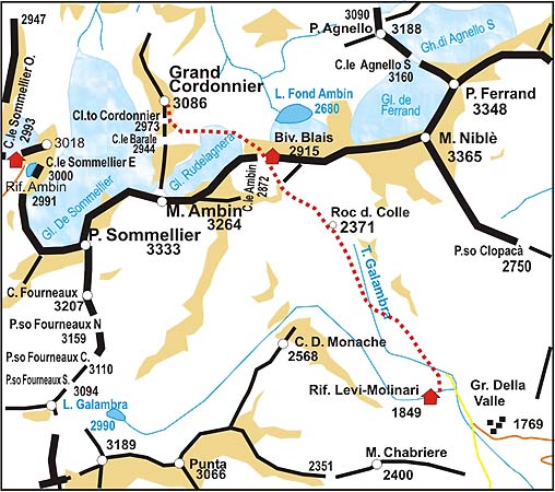 Rifugio Levi-Molinari Si trova nella conca delle Grange della Valle, a m. 1849, nel comune di Exilles. Sorge in mezzo ad un rado bosco nel Vallone di Galambra, di proprietà del CAI Torino. Accesso : Lungo la SS 24 in direzione Bardonecchia, oltrepassato il paese di Exilles, si distacca sulla destra la carrozzabile che sale alla frazione di Eclause e prosegue inoltrandosi nel vallone di Galambra, fino alla località Grange della Valle m. 1769. ( Ampio parcheggio in prossimità del ponte) la carrozzabile ora sterrata prosegue ancora un paio di tornanti fino alla quota del rifugio, ( parcheggi esigui ) che si trova nascosto nel bosco di larici. Prendere a sinistra la mulattiera che con breve discesa porta ad attraversare un torrentello e sale al rifugio h. 0.10. - Cresta sud- versante est; via Barale Difficoltà : PD Dislivello : 1300 m. Tempo : 4.30 ore salita vetta Luogo di partenza : Rif. Levi-Molinari m. 1849 Dal rifugio Levi-Molinari 1849, salire fino al termine della carrozzabile del vallone di Galambra, indi lungo sentiero ben segnalato proseguire lungo la sinistra idrografica del vallone. A 2371 m. un grosso masso detto, Roc del Colle, presso cui vi è un ottima sorgente. Per sentiero tra i massi sempre più ripido raggiungere il colle D'Ambin m. 2921 presso cui sorge il bivacco W. Blais ( h 2.15 ) Scendere verso ONO sul versante francese e raggiungere il laghetto 2854 m.. Portarsi alla base del tozzo torrione 2894 m. , contro il quale termina attualmente il Ghiacciaio Rudelagnéra. Traversare in leggera discesa per detriti sotto la fronte crepacciata del ghiacciaio fino a raggiungere una conca 2800 m. c. dalla quale un canalone detritico porta al colletto Cordonnier m. 2973 ( h. 1.00). Seguire per un tratto la cresta per facili rocce, poi piegare a destra ( versante est) per cengie e canalini di erba e facile rocce fin sotto la vetta che si raggiunge per ripide placche con ottimi appigli ( II ° grado ; h1.00) Discesa : per l’ itinerario di salita Per avere maggiori informazioni o se volete farvi accompagnare nell'ascensione : Scuola Italiana di Alpinismo, Scialpinismo e Arrampicata