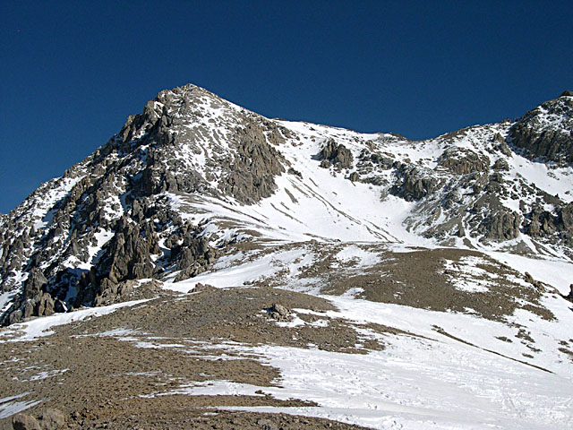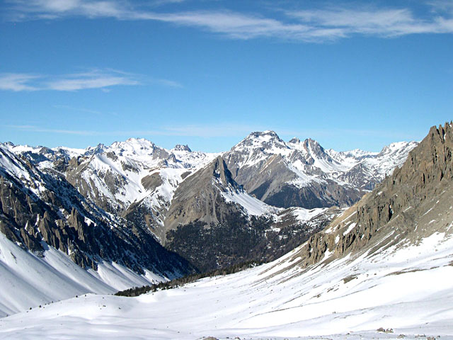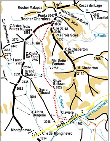 Difficoltà : F ( alpinisti ) Dall’abitato di Claviere m. 1750, appena prima del ex posto di dogana, svoltare a destra lungo il torrente Rio Secco e parcheggiare nei pressi della partenza della seggiovia. Salire più o meno direttamente per i prati fino a raggiungere la strada sterrata che si inoltra nel vallone di Rio Secco in direzione N, seguirla fino alle Grange di Baisses m. 2029 (1.00). Per sentiero o per la strada salire sul pianoro posto a monte delle grange, attraversarlo sempre in direzione N, oltrepassare la stazione di un'altra seggiovia e proseguire ancora nella medesima direzione attraversando il pianoro lungo la mulattiera (poco visibile all’inizio del prato), seguendo dossi erbosi si sale fino al Colle des Trois Freres Mineurs m. 2589, passando a sinistra della dorsale mediana della Cima Clots des Fonds (1.30h ). Dal colle si prende la cresta di erba e detriti non molto inclinata fino alla quota 2737 m., poi ripida di detriti e rocce rotte fino oltre i 2900 m. e quindi detritica e meno inclinata fino all’anticima m. 3056 e, volgendo a sinistra NE per rocce rotte in vetta (1.30 h). Discesa : dalla vetta più o meno direttamente lungo il versante sud costituito da larghi pendii di mobili detriti e rocce rotte. Per avere maggiori informazioni o se volete farvi accompagnare nell'ascensione : Scuola Italiana di Alpinismo, Scialpinismo e Arrampicata