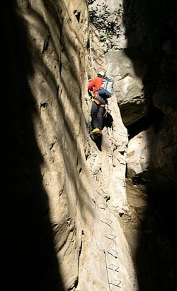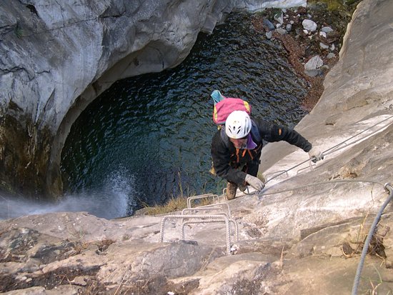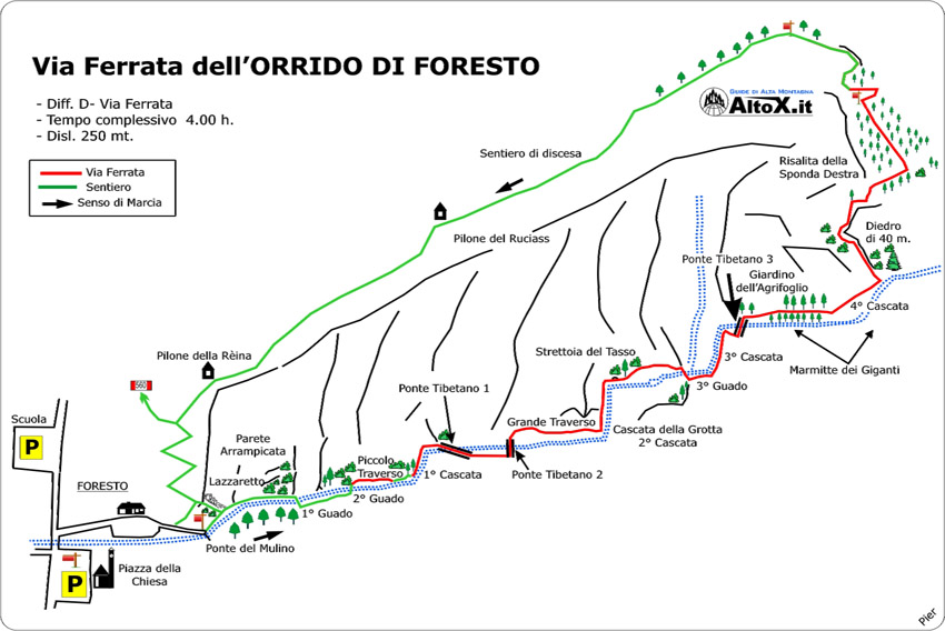 Vie Ferrata ORRIDO di FORESTO Foresto m. 550 La Via Ferrata dell’Orrido di Foresto non è una novità, anzi molti escursionisti ed alpinisti con qualche anno di attività alle spalle forse l’ hanno già percorsa. Di fatto la Via, di recente fattura, non è altro che la ricostruzione di un vecchio itinerario, attrezzato negli anni 60 da un gruppo di volontari, appartenenti al Club Alpino Italiano. La via è stata utilizzata per circa un ventennio, poi chiusa, ed in parte smontata, in quanto divenuta eccessivamente pericolosa. Nel Novembre del 2003, su iniziativa delle Guide Alpine della Valle e con i denari stanziati dal Comune di Bussoleno, la “Via Ferrata dell’Orrido di Foresto” è stata ricostruita e leggermente variata nel suo percorso originale, per meglio sfruttarne alcune zone e nel contempo renderla più sicura. Un ulteriore intervento nel 2010, ha permesso la realizzazione di tre ponti tibetani che rendono ancora più spettacolare l’itinerario. Oggi il nuovo percorso presenta molto più “ferro“ di quello originale, il che facilità e rende la salita più agevole, pur rimanendo un itinerario di una certa difficoltà con un paio di brevi tratti molto impegnativi. L’itinerario si snoda completamente all’interno della profonda gola, scavata in tempi antichi dal Rio Rocciamelone, nelle tenere rocce calcaree che sovrastano l’abitato di Foresto, l’ambiente è tetro e spettacolare nel medesimo tempo, il torrente che scorre impetuoso costantemente sul fondo del canyon, crea cascate e pozze straordinarie, tanto da impressionare l’escursionista non abituato a certi ambienti. I fianchi dell’Orrido sono molto scoscesi e ripidi ed in molti tratti verticali o strapiombanti, pertanto non offrono nessuna via di fuga, il che rende il percorso decisamente emozionante. Difficoltà D- via ferrata, dislivello 250 m. tempo complessivo necessario 3 – 5 h. Note: è fortemente consigliato affrontare il percorso in presenza di piene o comunque quando il torrente ha una grossa portata d’acqua e tanto meno in periodi piovosi o temporaleschi. In ogni caso vista la conformazione dell'ambiente la possibilità di caduta pietre e o frane/smottamenti dalle pareti dell'Orrido non potrà mai essere esclusa. Descrizione :