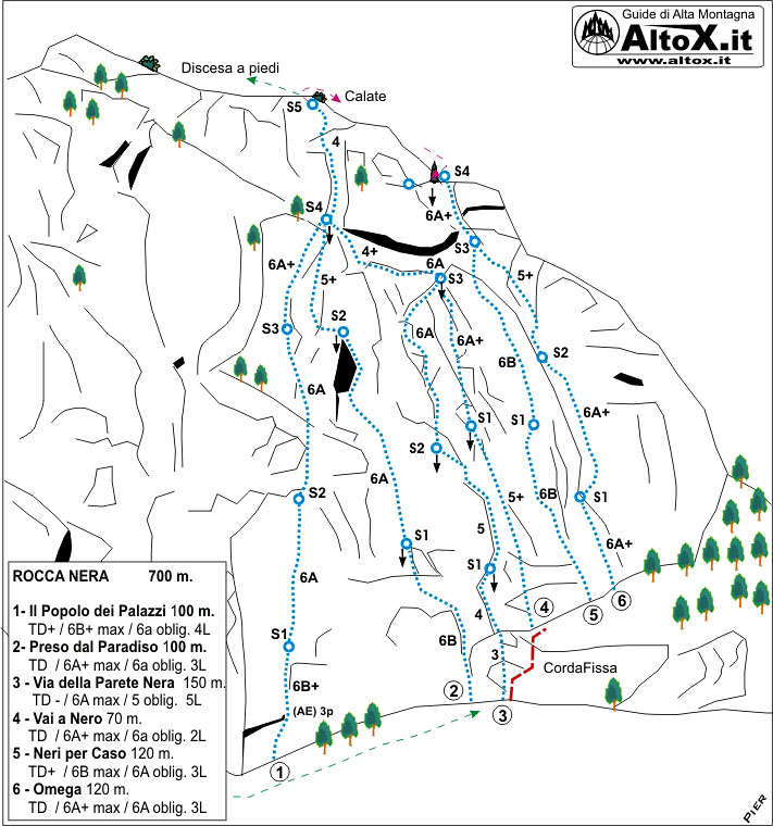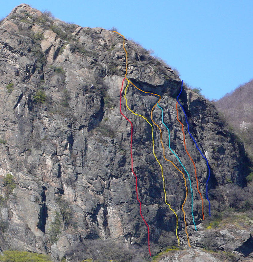 NB. Nel disegno non sono riportati i monotiri; le vie N. 2 e N. 3 pur non