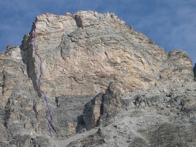 La via segue l’ evidentissimo spigolo molto aereo ed esposto nella parte alta,