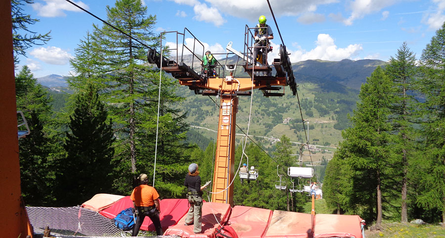 - Corso di Formazione al corretto utilizzo dei DPI Anticaduta nei lavori temporanei in quota Destinatari: Corso di formazione destinato ai lavoratori (ordinati e/o subordinati) che operando nel contesto degli impianti di risalita a fune (Seggiovia – Telecabina – Funivia) sentano la necessità di occuparsi in primis dell’eventuale applicazione del piano di emergenza per l’evacuazione delle linee aeree. Pertanto si richiede un utilizzo intenso di molteplici soluzioni di sistemi DPI, DPI di ideazione complessa, utilizzo di funi, utilizzo di attrezzature di soccorso (Cordino di posizionamento regolabile, dispositivi di trattenuta, anticaduta scorrevoli e retrattili, ancoraggi portatili, funi e discensori, triangolo di evacuazione ….etc. ) Scopo della formazione